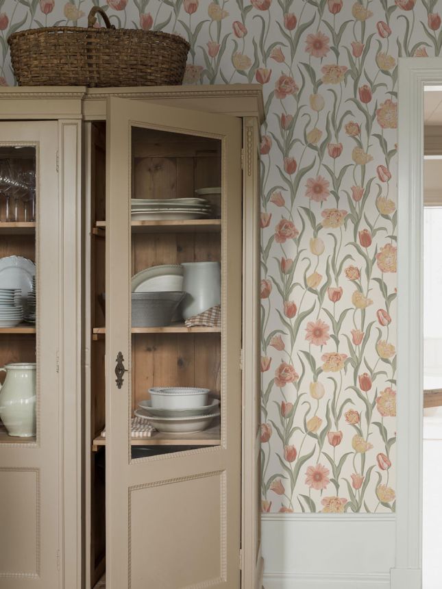 Tapeta na stenu, krémový podklad, kvety, tulipány v odtieňoch zelenej, ružovej a marhuľovej.
