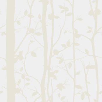 Tapeta na stenu, hladká, matný biely podklad, lesklý krémový motív stromov a listov.