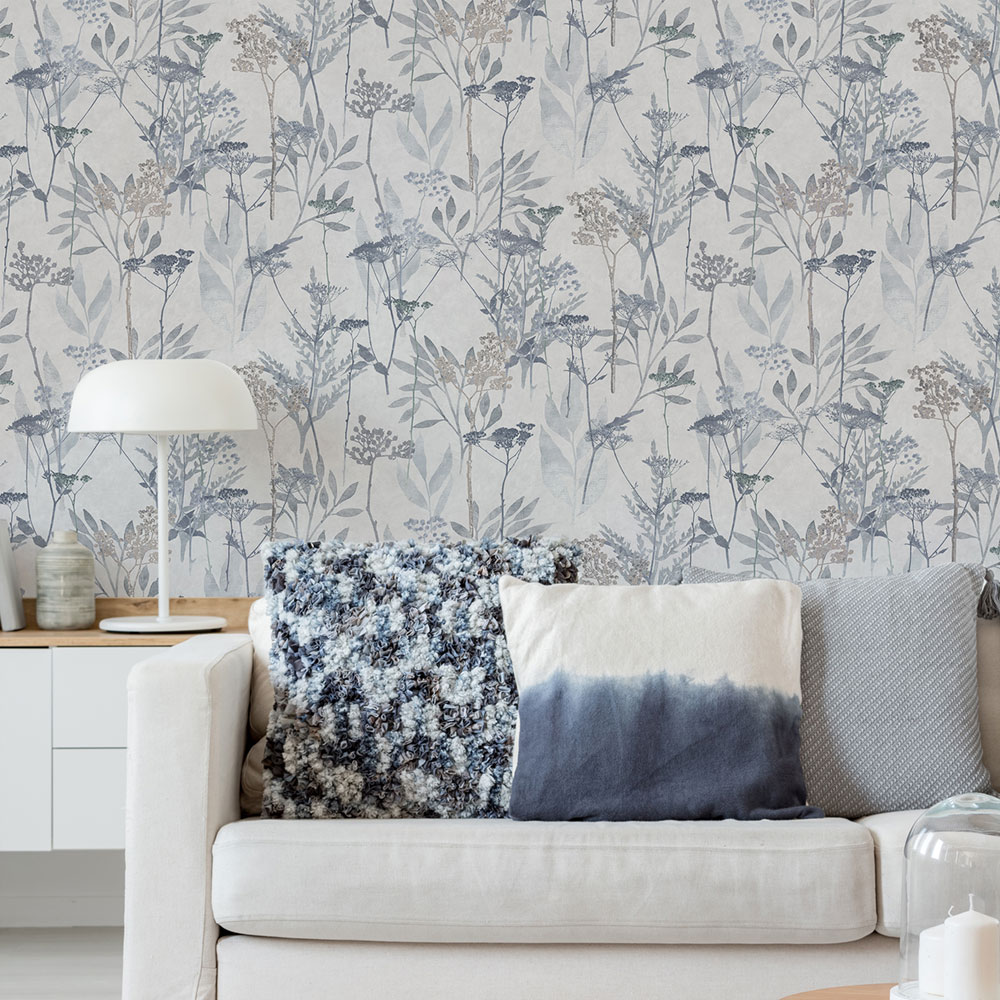 Tapeta s vinylovým povrchom, biely štukový podklad, motívy lúčnych tráv a listov v odtieňoch modrej, miestami vzor s kovovým pololeskom.