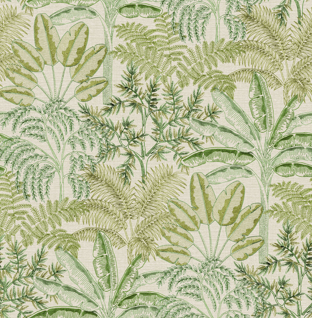 Tapeta s vinylovým povrchom, hrubšia krémová látková textúra, motívy rastlín a listov v odtieňoch zelenej.