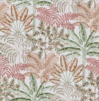 Tapeta s vinylovým povrchom, hrubšia sivá látková textúra, motívy rastlín a listov v odtieňoch hnedej a zelenej.