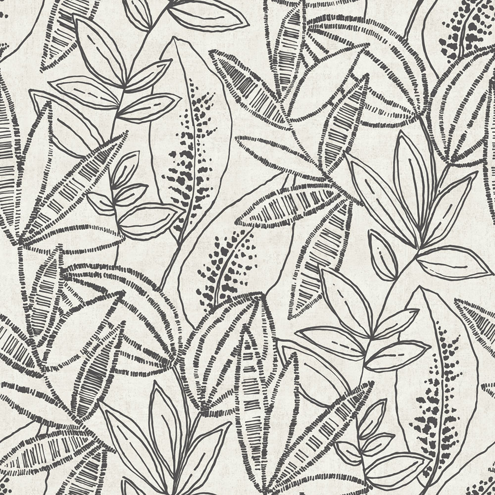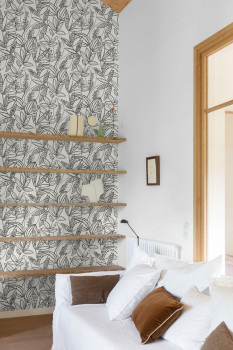 Tapeta s vinylovým povrchom, svetlosivý podklad, čierne obrysy listov.
