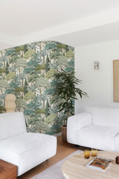 Tapeta s vinylovým povrchom, krémový podklad, motív stromov v odtieňoch zelenej a hnedej, jemná textúra.