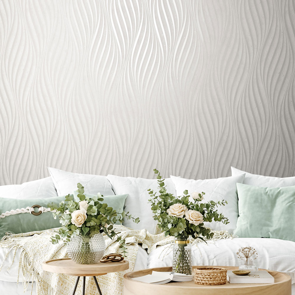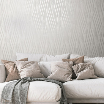 Biela tapeta s vinylovým povrchom, reliéfný metalický vlnkový vzor.