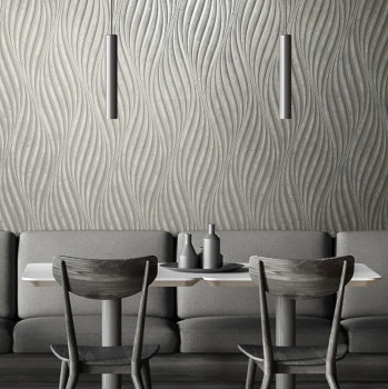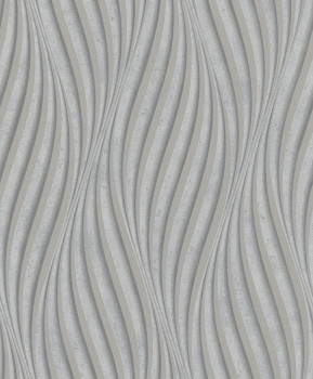 Sivo-strieborná tapeta s vinylovým povrchom, reliéfný strieborný vlnkový vzor.