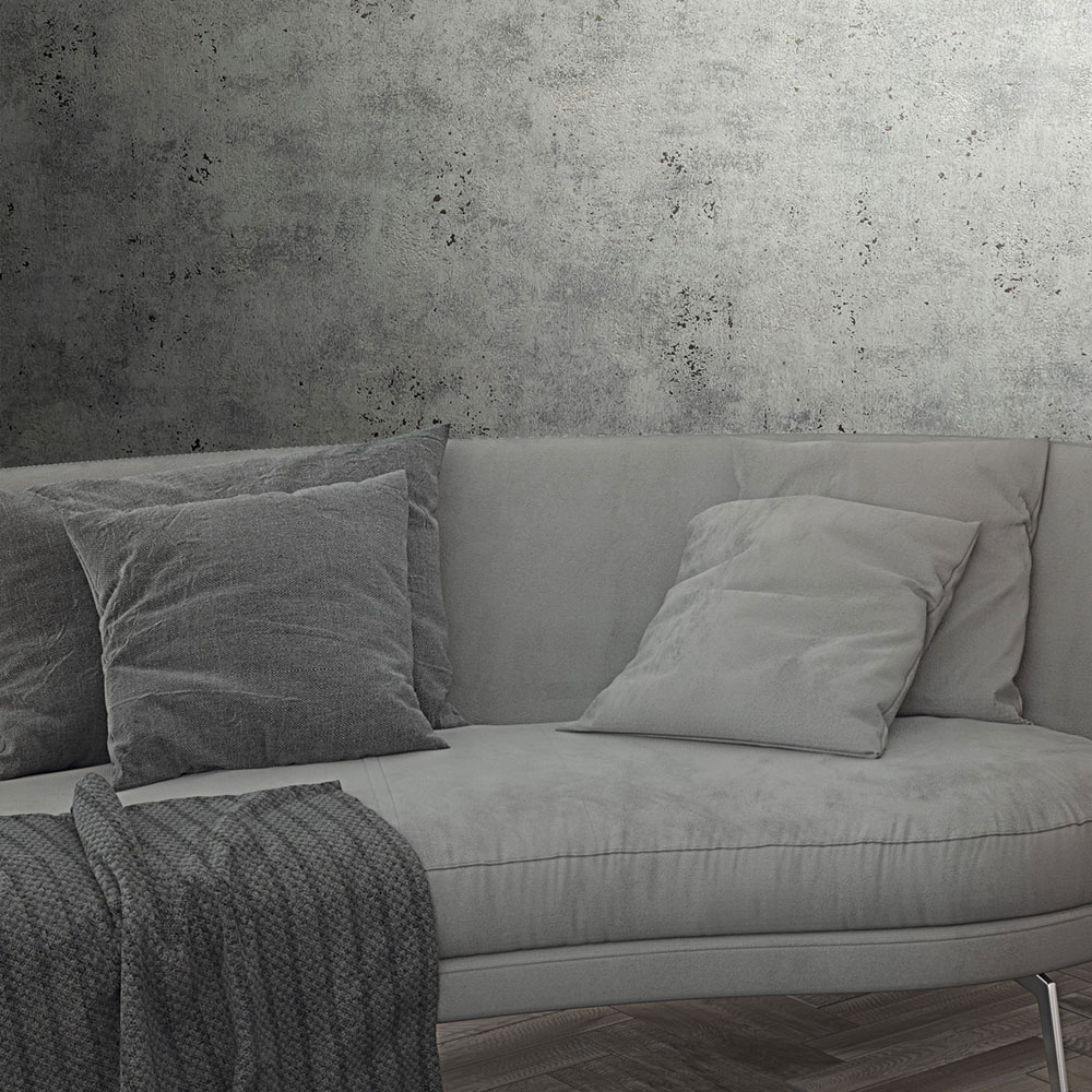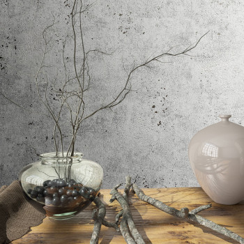 Sivo-strieborná tapeta s vinylovým povrchom, dekor štukovej omietky, mat a jemný pololesk, jemná textúra.