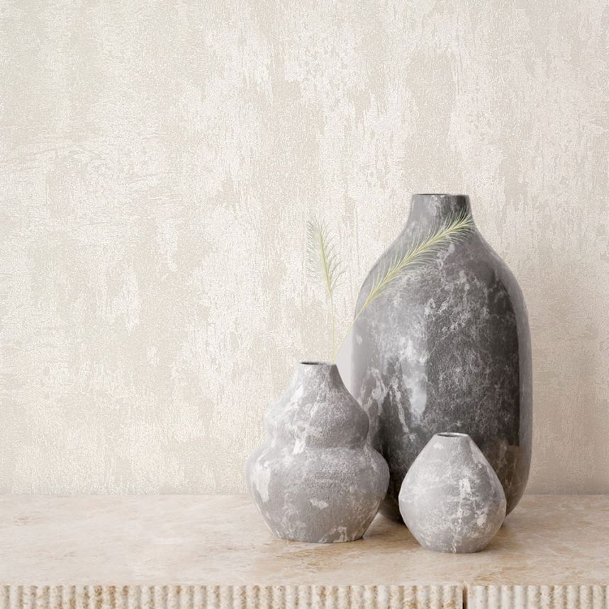 Tapeta s vinylovým povrchom, dekor bielej štukovej omietky, mat a jemný pololesk, jemná textúra.