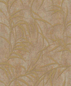 Tapeta s vinylovým povrchom, dekor pololesklej hnedej štukovej omietky s reliéfnymi lesklými zlatými listami.