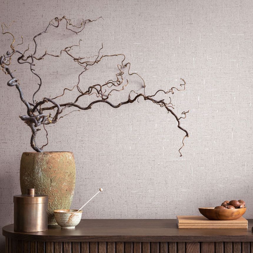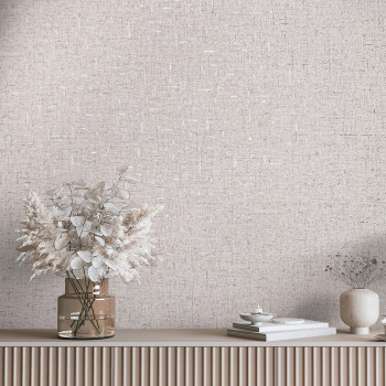 Tapeta s vinylovým povrchom, textilná štruktúra v béžových odtieňoch, miestami lesklé detaily a metalické plôšky.