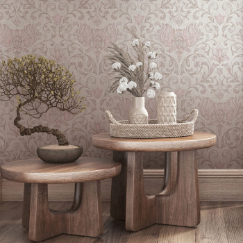 Tapeta s vinylovým povrchom, zámecký ornamentálny vzor vo vintage štýle, odtiene sivobéžovej a ružovej, jemná textúra.