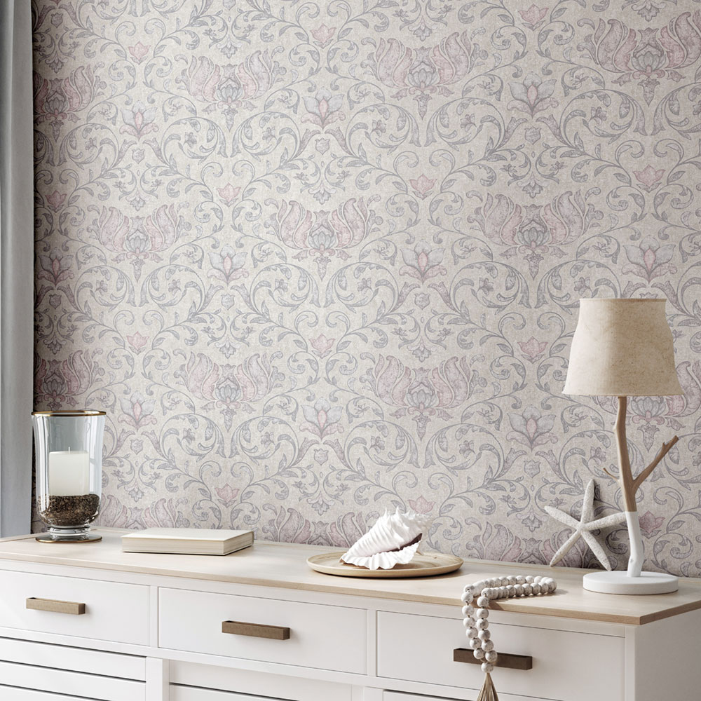 Tapeta s vinylovým povrchom, zámecký ornamentálny vzor vo vintage štýle, odtiene béžovej, sivej a ružovej, jemná textúra.