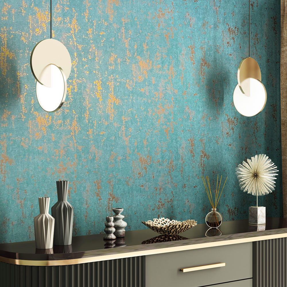 Tapeta s vinylovým povrchom, dekor tyrkysovej štukovej omietky, metalické zlaté reliéfy, jemná textúra.