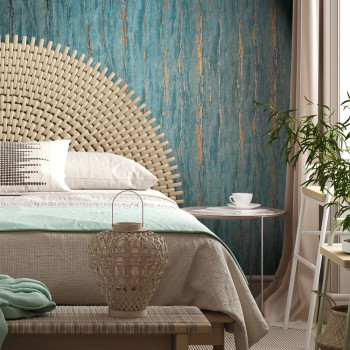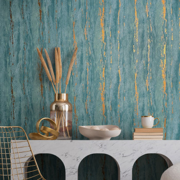 Tapeta s vinylovým povrchom, dekor tyrkysovej štukovej omietky, metalické zlaté reliéfy, jemná textúra.