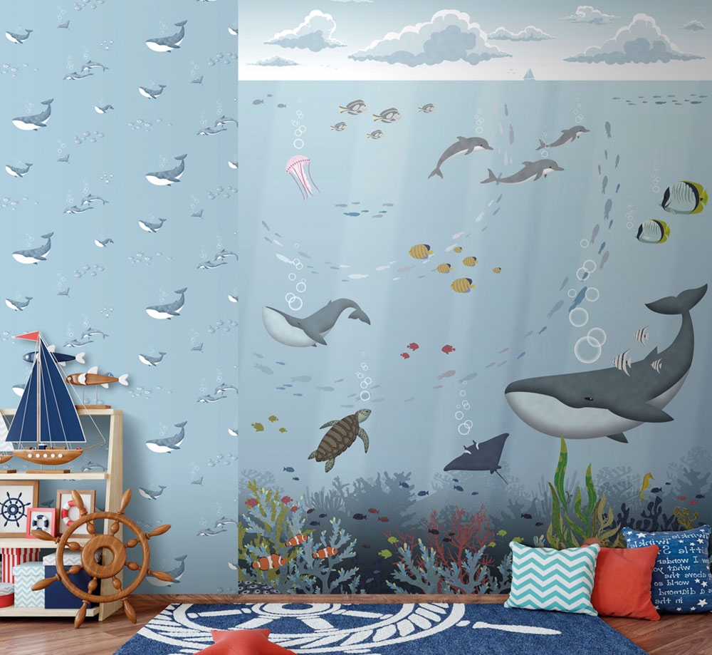 Zmeňte strohé steny v útulnú izbičku, kde sa vaše deti budú cítiť dobre. Sivý podklad, motívy morských rýb. Ľahko kombinujte so súvisiacimi vzormi.