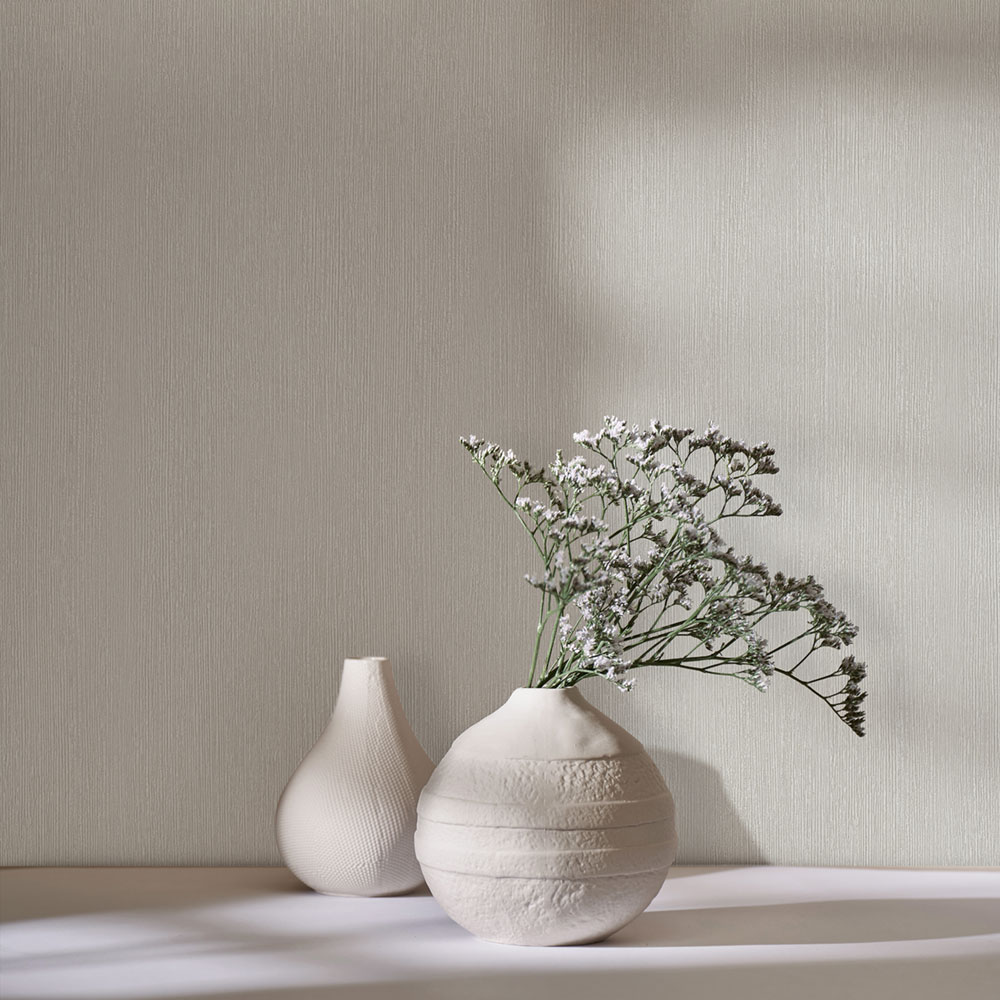 Tapeta s vinylovým povrchom, zvislá textúra pripomínajúca štruktúru dreva v odtieňoch sivokrémovej.