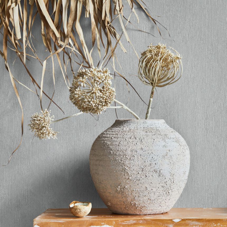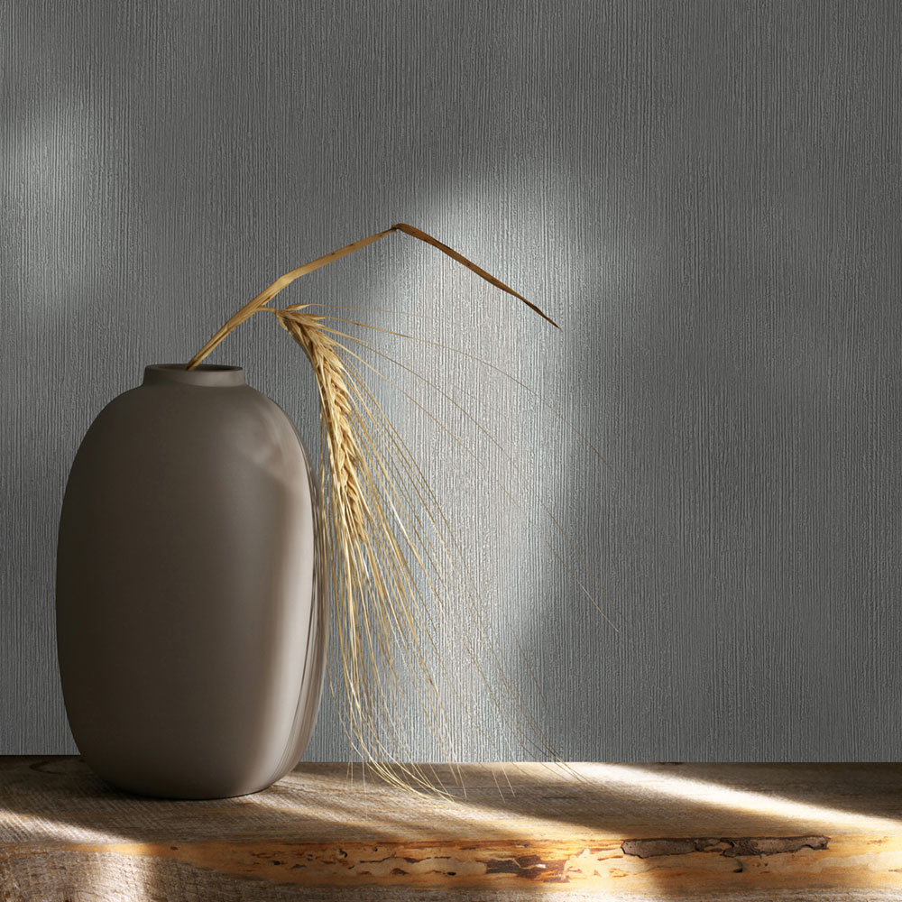 Tapeta s vinylovým povrchom, zvislá textúra pripomínajúca štruktúru dreva v odtieňoch sivej.