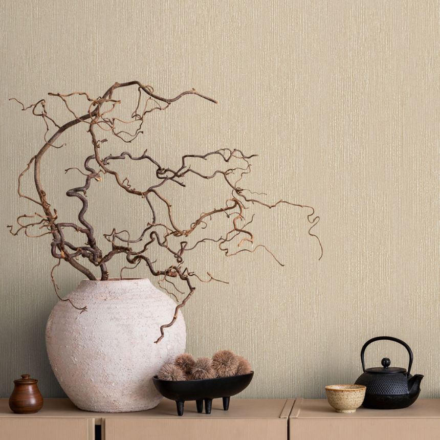 Tapeta s vinylovým povrchom, zvislá textúra pripomínajúca štruktúru dreva v odtieňoch béžovej.