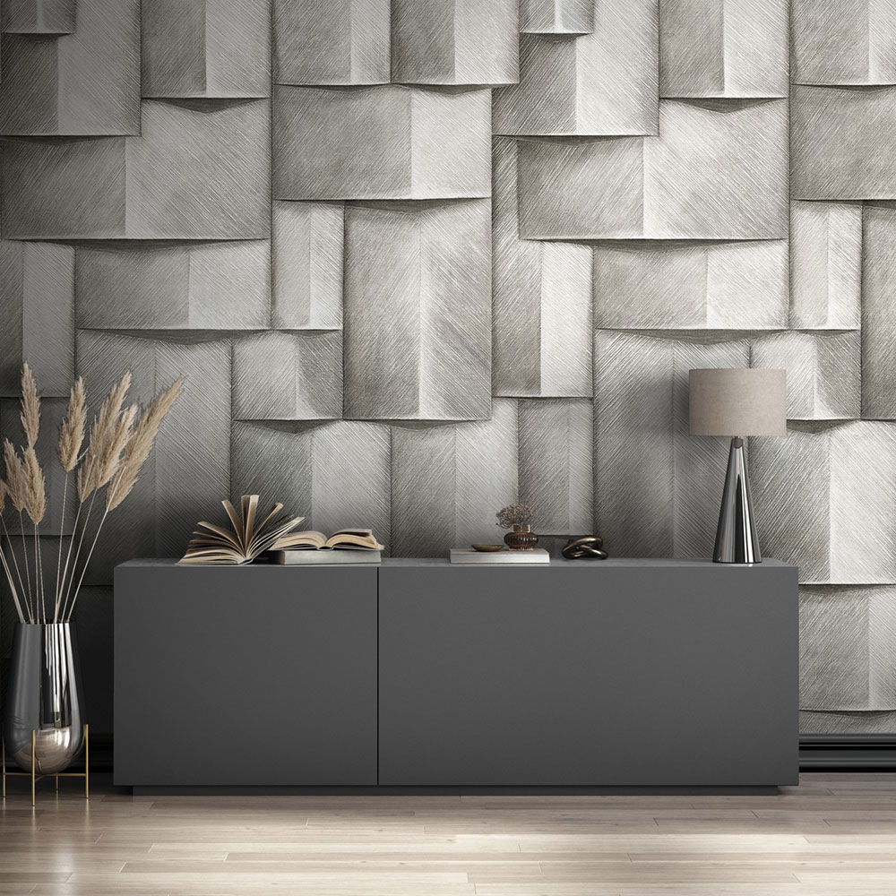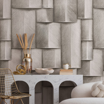 Tapeta s vinylovým povrchom, jemná textúra, grafický vzor, tieňovanie vytvára 3D efekt.
