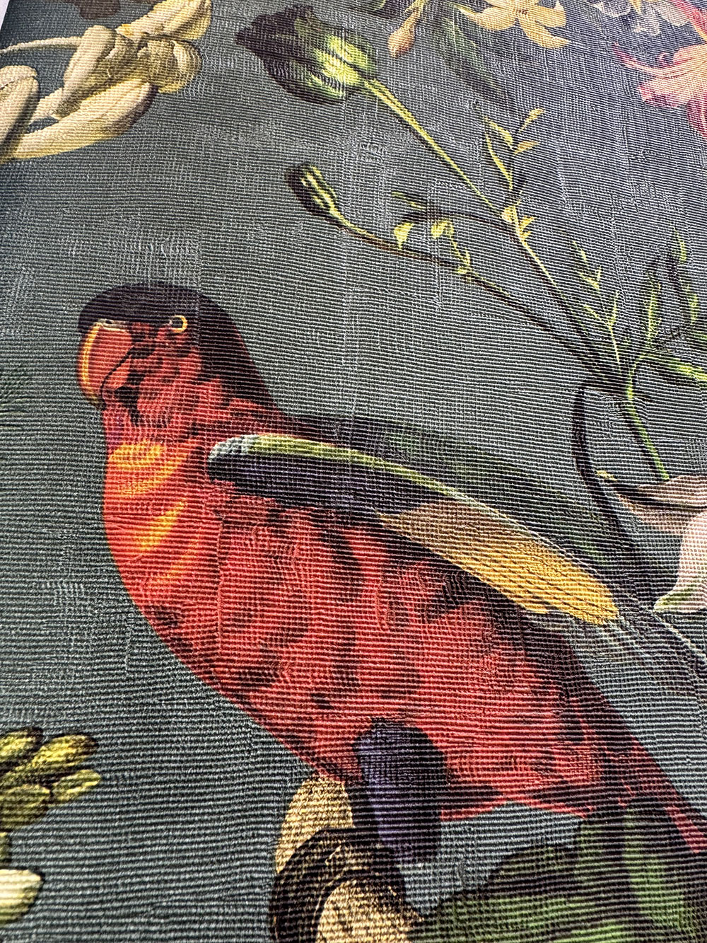 Viacfarebná luxusná tapeta s papagájmi a kvetmi inšpirovaná obrazmi holandských maliarov Zlatého veku.