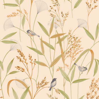 Tapeta, béžovozelená, lúčne trávy, vtáčiky, A83501, Inia, Grandeco