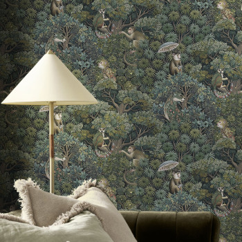 Tapeta, hnedo-zelená, listy, opice, 142311, Jaipur, Graham Brown Premium