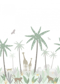 Vliesová biela obrazová tapeta s motívom džungle so zvieratami v jemných pastelových farbách. 4 diely