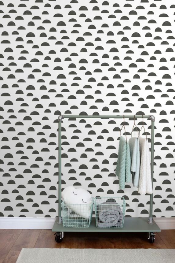 Vliesová, biela tapeta s jemným ružovým geometrickým vzorom.