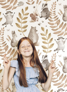 Hravá detská vliesová tapeta na stenu, zvieratká a lístky, biely podklad, zvieratká v odtieňoch hnedej a šedej, lístky ružové a zlaté.