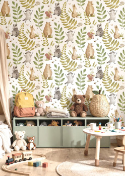 Hravá detská vliesová tapeta na stenu, zvieratká a listy, biely podklad, zvieratká v odtieňoch zlatej, hnedej a šedej, listy zelené a zlaté.