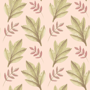 Hladká netkaná tapeta na stenu, ružový podklad, väčšie hnedozelené listy s dĺžkou 20 cm, menšie ružovo-hnedé listy s dĺžkou 15 cm.