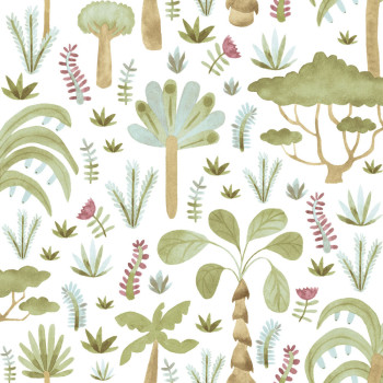 Detská vliesová tapeta na stenu, tropické rastliny, biely podklad, rastliny v zelenej, modrej, hnedej a fialovej farbe.