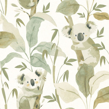 Hravá detská tapeta z netkanej textílie, s medvedíkmi koala a rastlinami v odtieňoch zelenej, zlatej a šedej na zeleno-bielom pozadí.