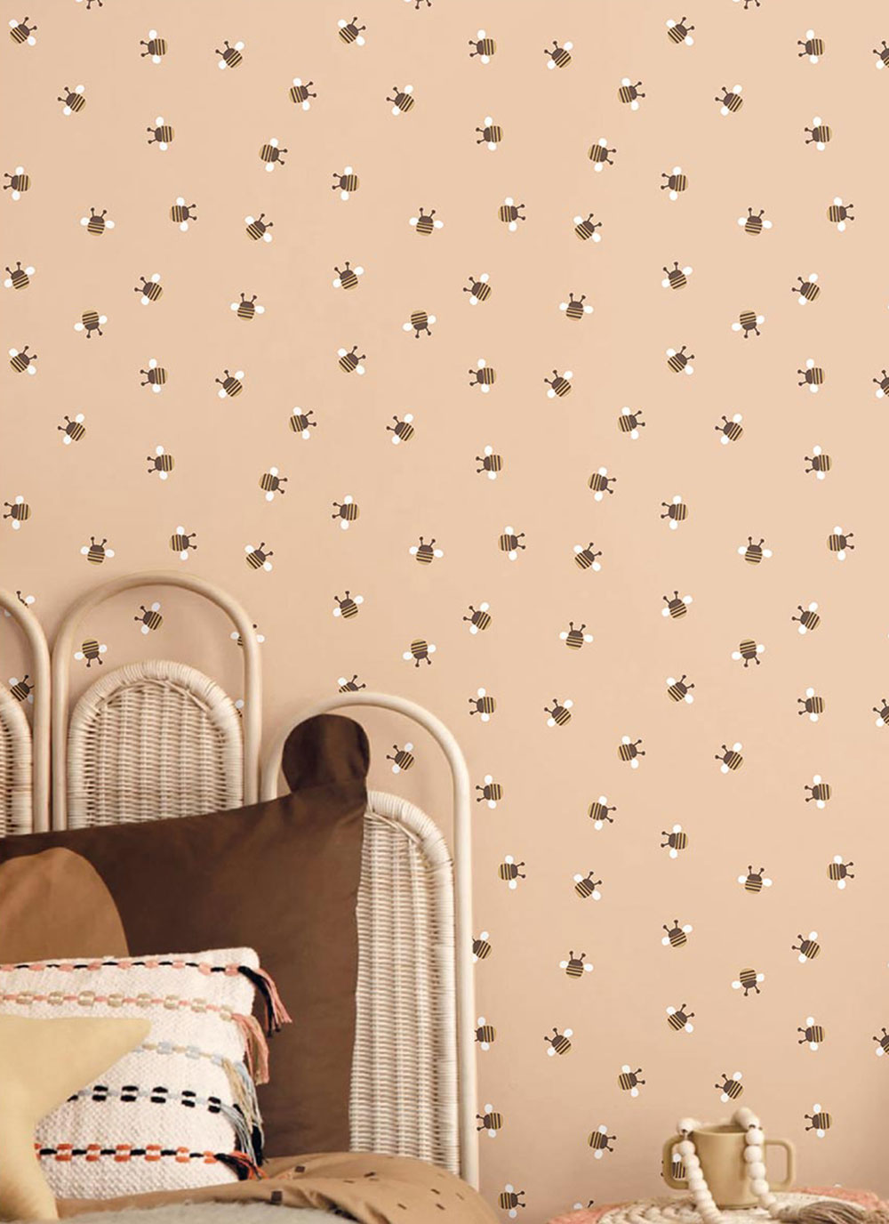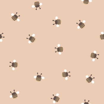 Roztomilá detská vliesová tapeta na stenu, včielky, ružový podklad, včielky v hnedej, zlatej a bielej farbe.