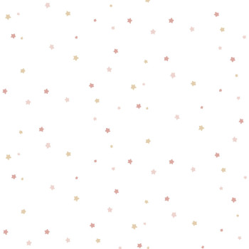 Hladká vliesová tapeta na stenu, biely podklad, hviezdičky v zlatej farbe a odtieňoch ružovej, s rozmermi 0,5 a 1 cm.