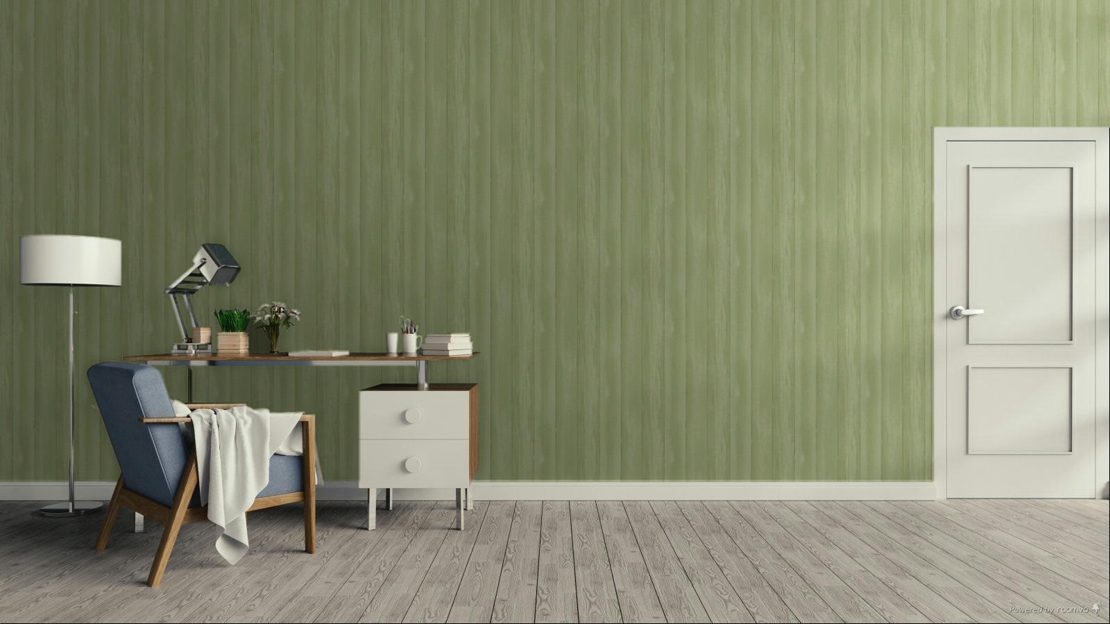 Hladká zelená vliesová tapeta na stenu, tieňovanie vytvára efekt drevených dosiek so šírkou 8 cm.