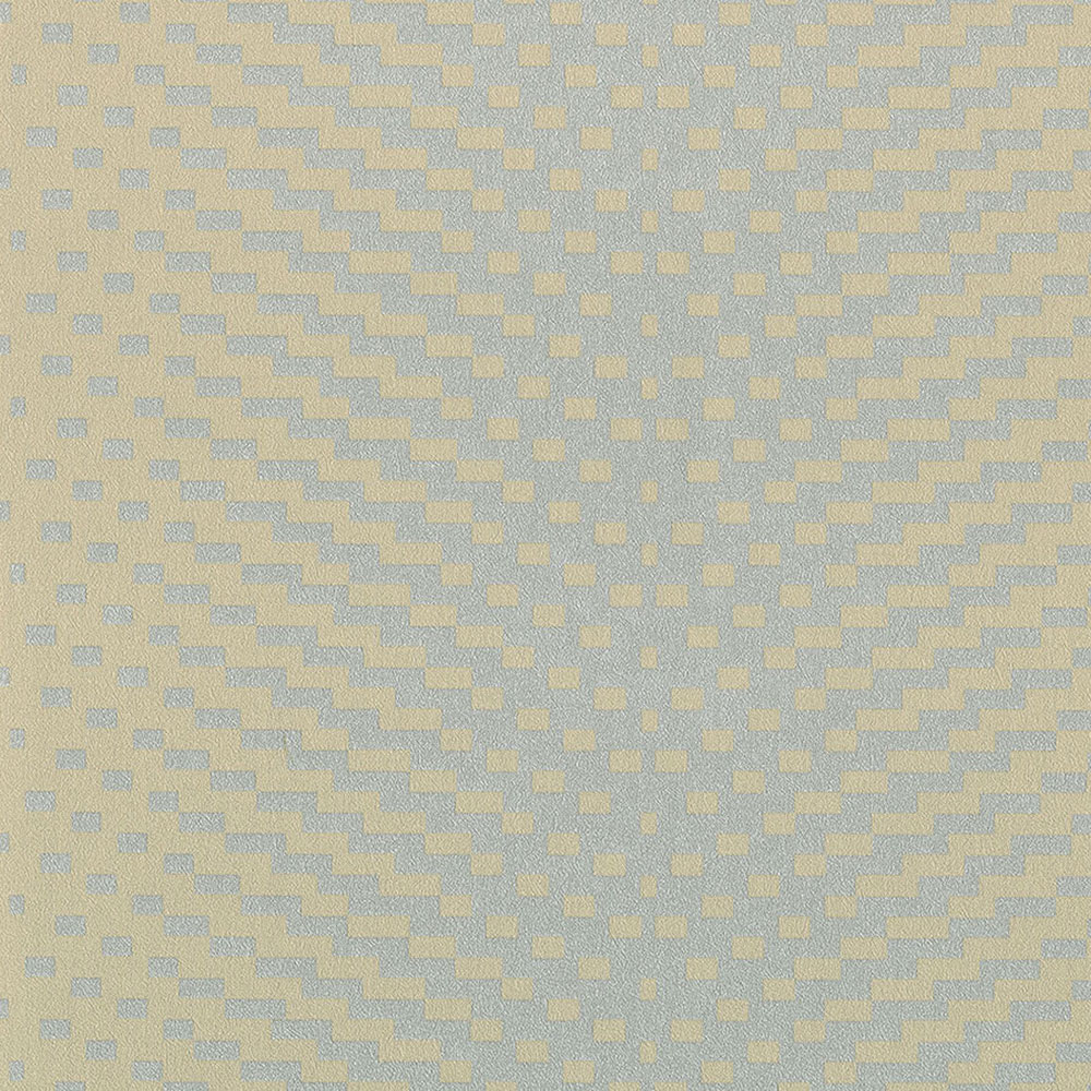 Vliesová matná béžová tapeta so sivo-modrým geometrickým vzorom s jemným pololeskom.