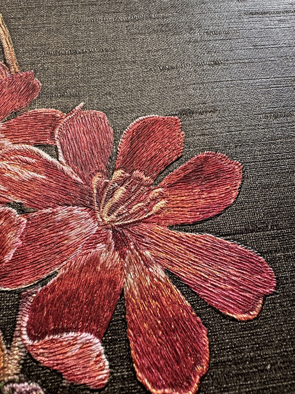 Luxusná vliesova tapeta s čiernym podkladom a metalickými vínovými kvetmi.