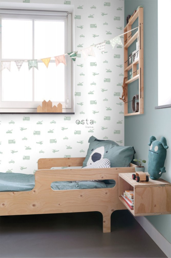 Vliesová chlapcenska tapeta na stenu, zelené autá, vrtuľníky na bielom podklade.