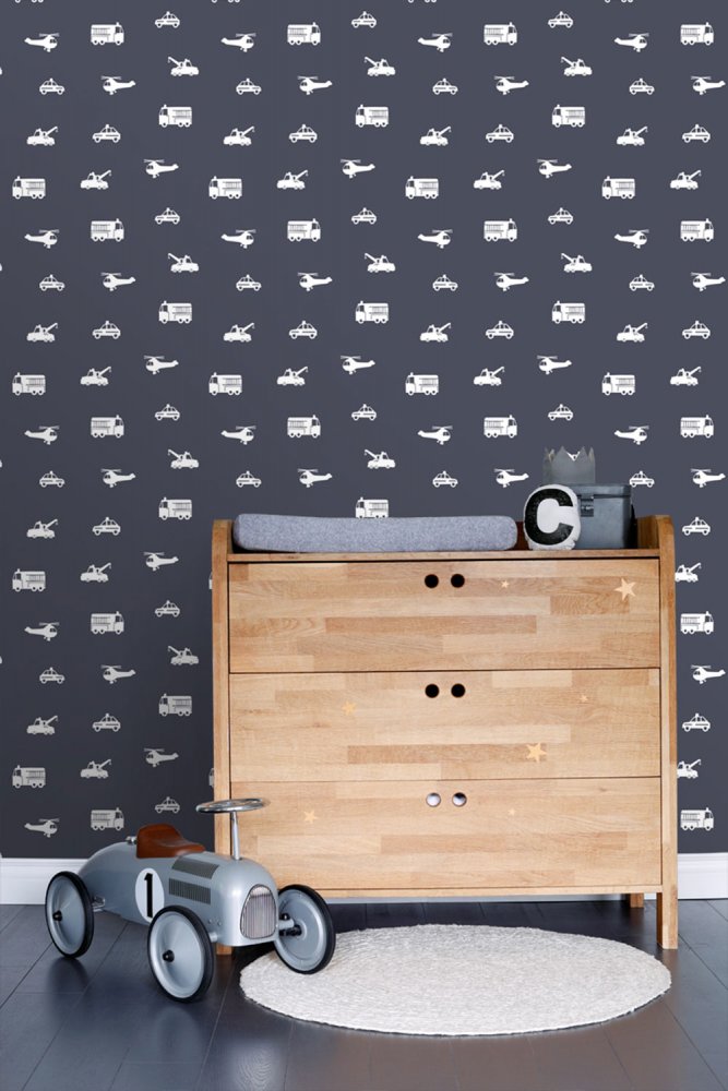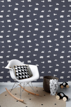 Vliesová chlapcenska tapeta - autá, žeriavy, vrtuľníky, tmavomodrý podklad, biely vzor.