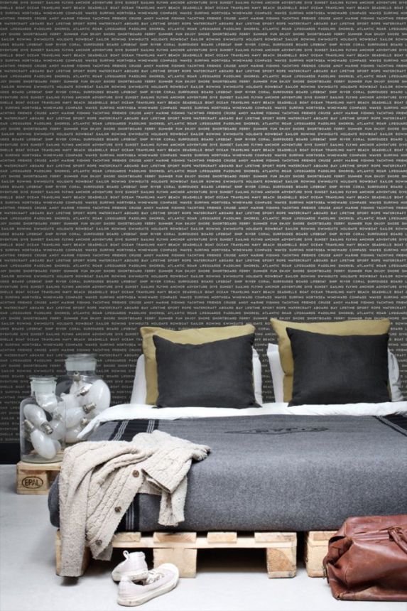 Vliesová tapeta na stenu, čierna tapeta s bielymi nápismi s námorníckou tématikou.