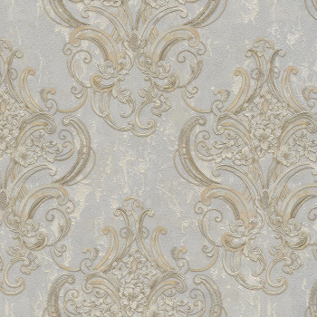 Svetlosivá strieborná a zlatá luxusná vliesová tapeta s výrazným ornamentálnym vzorom.