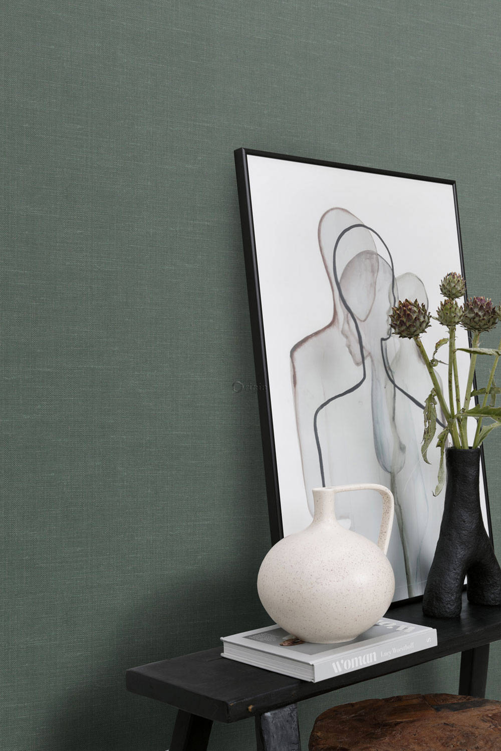 Vliesová tapeta na stenu, imitácia režnej látky, melanž v odtieňoch zelenej.