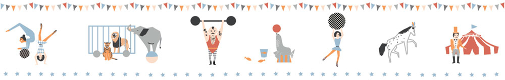 Biela detská samolepiaca bordúra s motívmi z cirkusu. Ľahko skombinujete so súvisiacimi tapetami na stenu.