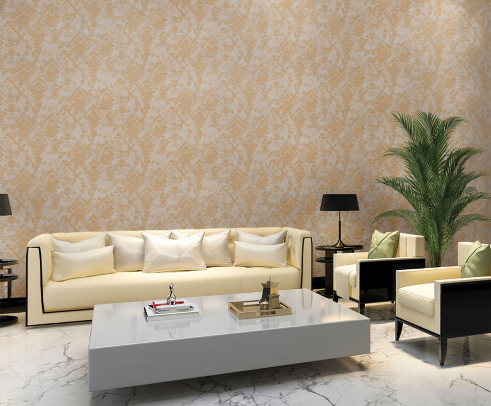 Šírka rolky 1,06m. Béžová luxusná plastická vliesová tapeta na stenu - vinylový povrch, zlatý zámocký ornamentálny vzor.
