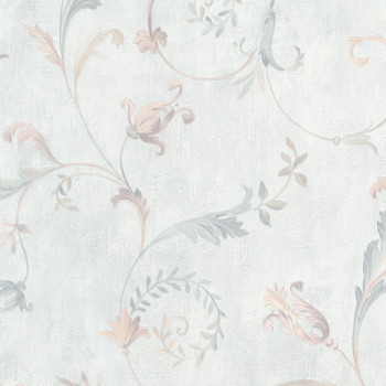 Luxusná vliesová tapeta s rastlinnými ornamentmi na jemnom štukovom podklade v svetlosivej farbe.