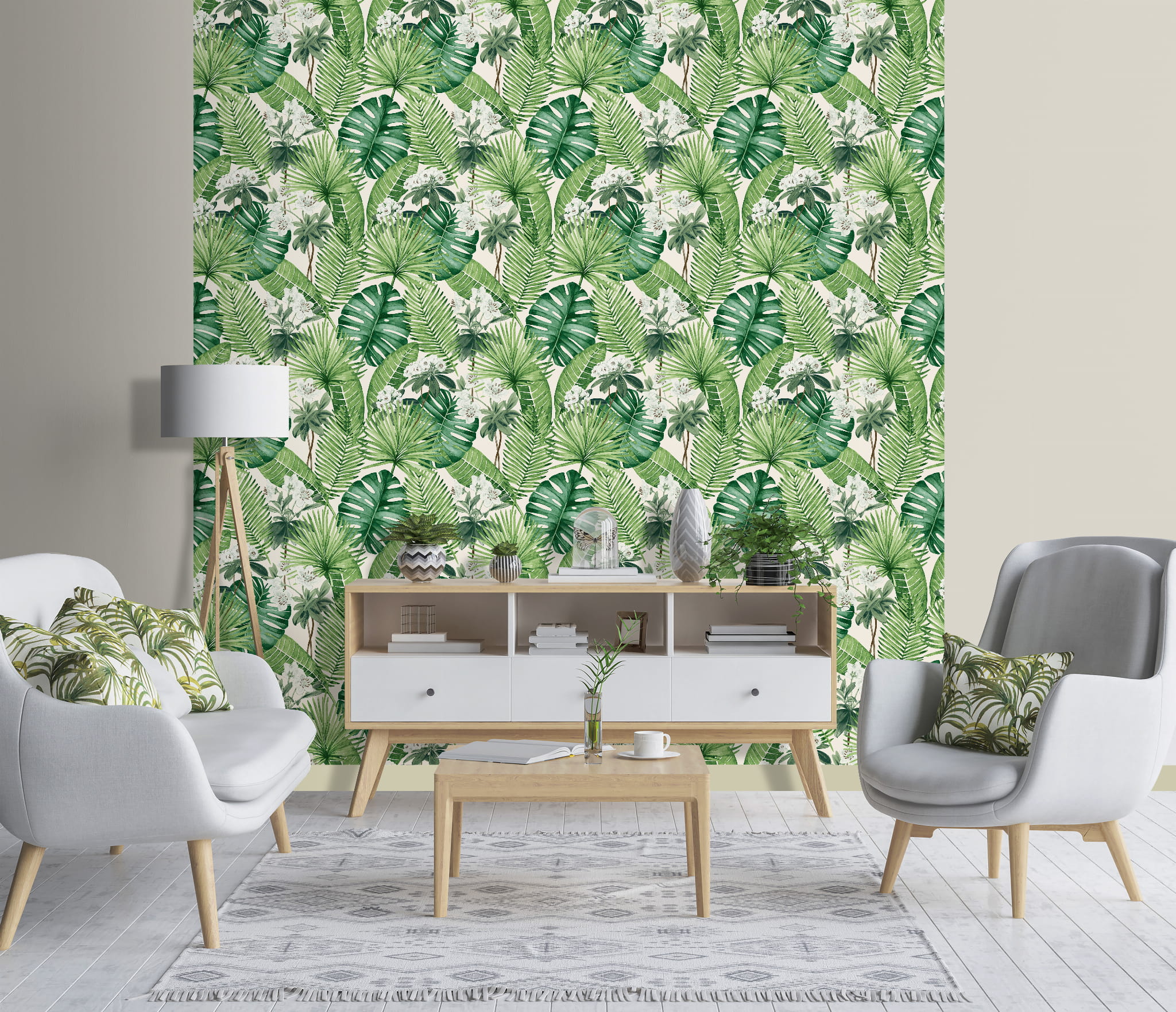 Vliesová tapeta na stenu so zelenými listami na bielom podklade.