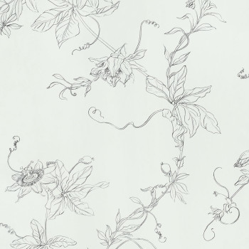 Vliesová tapeta na stenu s vinylovým povrchom a motívom čiernych rastlín a kvetov na bielom podklade.