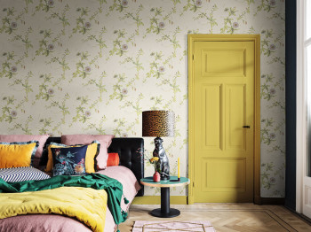 Vliesová tapeta na stenu s vinylovým povrchom a motívom rastlín a kvetov na béžovom podklade.