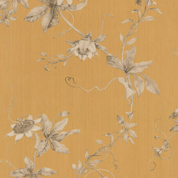 Vliesová tapeta na stenu s vinylovým povrchom a motívom rastlín a kvetov na žltom podklade.
