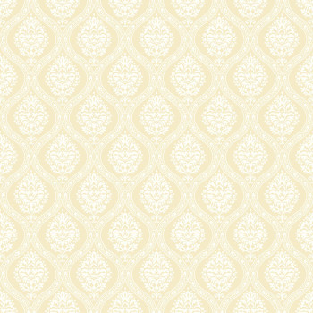 Žltá predglejená tapeta na stenu, biely jemne plastický zámocký damaškový vzor.